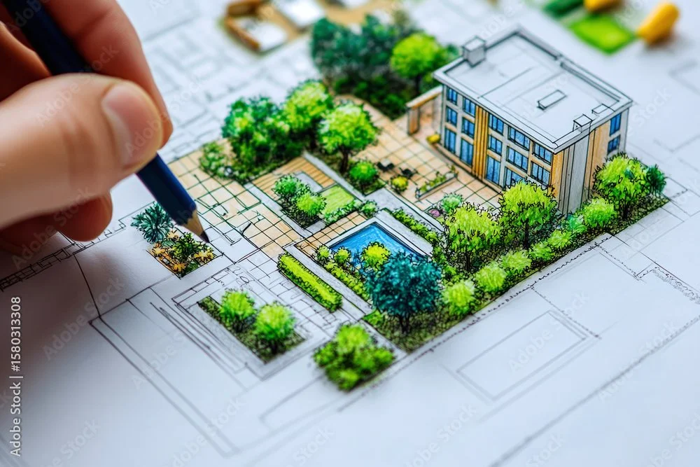 Architectural drawing of a modern building and landscape with trees, a swimming pool, and paved walkways being drawn with a pen.